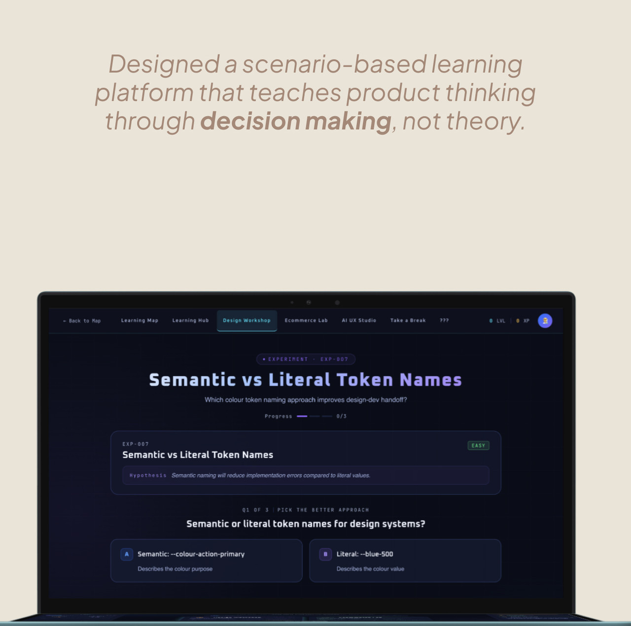 Scenario-based learning product teaching product thinking through real decisions.